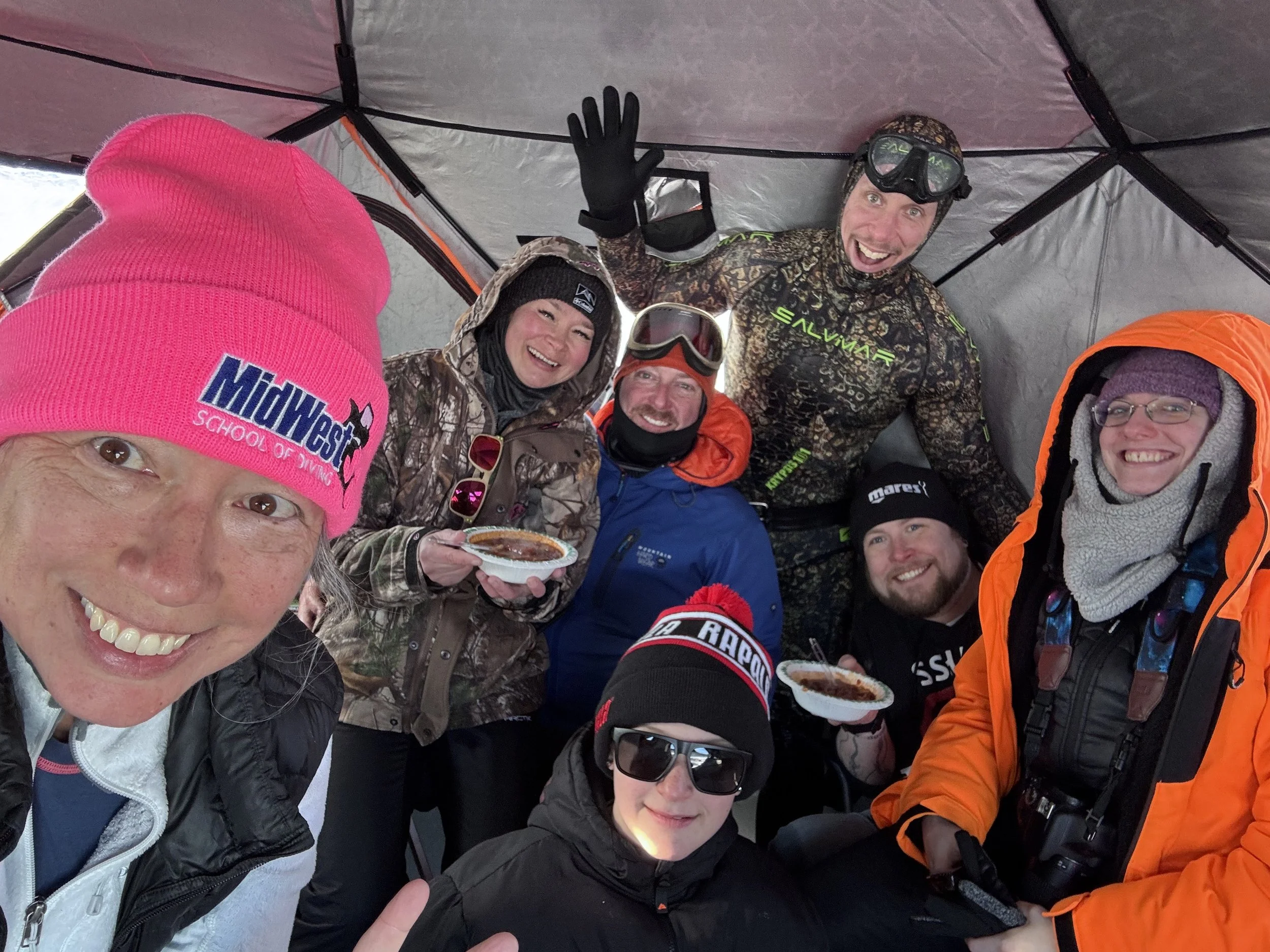 The site chosen for this historic event was Lake Ore-Be-Gone, a northern Minnesota lake known for its exceptional water clarity and remote setting. Upon arrival on March 13, participants were met with classic Minnesota conditions - a blizzard delivering over a foot of snow and strong winds. Despite the harsh weather, the team came together to prepare the site, demonstrating the collaborative spirit essential to under-ice diving. Tasks ranged from constructing shelters and cutting a 6-by-10-foot entry hole through 24 inches of ice, to heating water for divers and organizing food and warming stations.